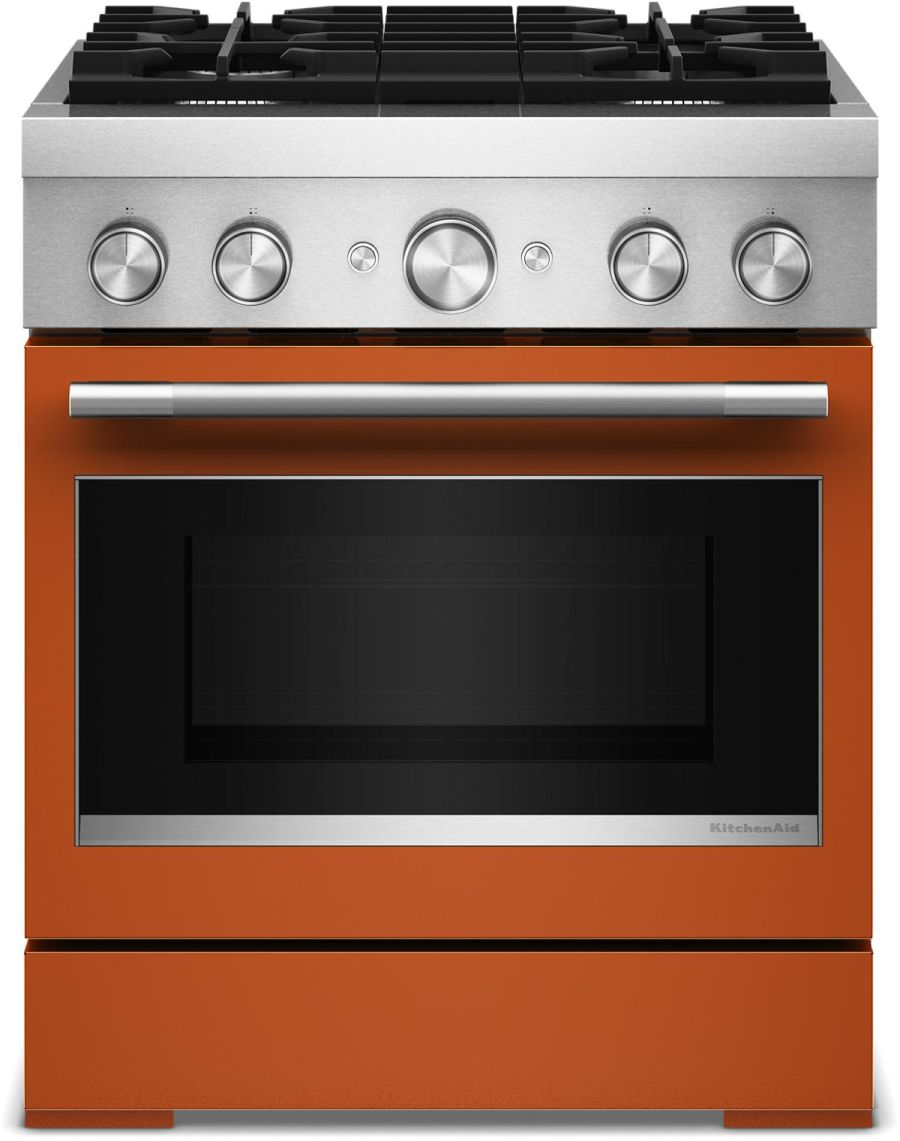 Empower your creativity with a 30-inch KitchenAid® Commercial Style Range with 4 burners. This dual fuel range combines a gas cooktop with the even baking of an electric oven. Two versatile 20,000 BTU Ultra Power™ Dual-Flame Burners offer the power and precision to sear, simmer, stir-fry and sauté. Even-Heat™ True Convection gives consistent baking and roasting, plus air fry mode that yields crispy, golden results.Read More