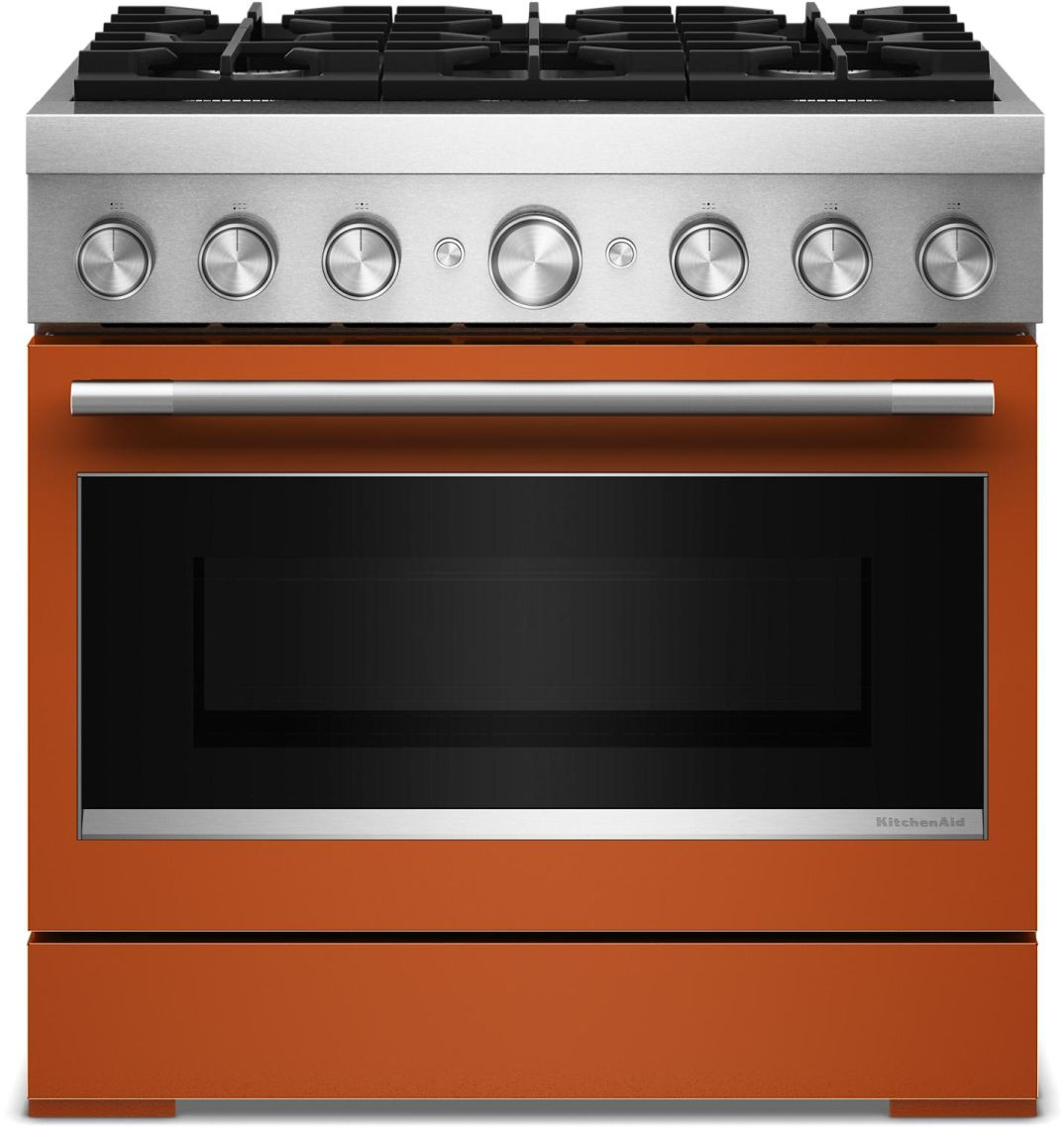 Expand your skills with a 36-inch KitchenAid® Commercial Style Range with 6 burners. This dual fuel range combines a gas cooktop with the even baking of an electric oven. Two 20,000 BTU Ultra Power™ Dual-Flame Burners offer the power and precision to successfully sear, simmer, stir-fry and sauté. Even-Heat™ True Convection gives consistent baking and roasting, plus air fry mode that yields crispy, golden results.Read More