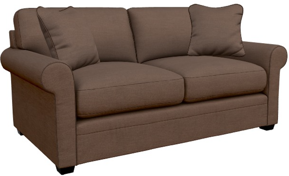 Rolled arms, decorative wood legs and welt trim lend laid-back sophisticated style