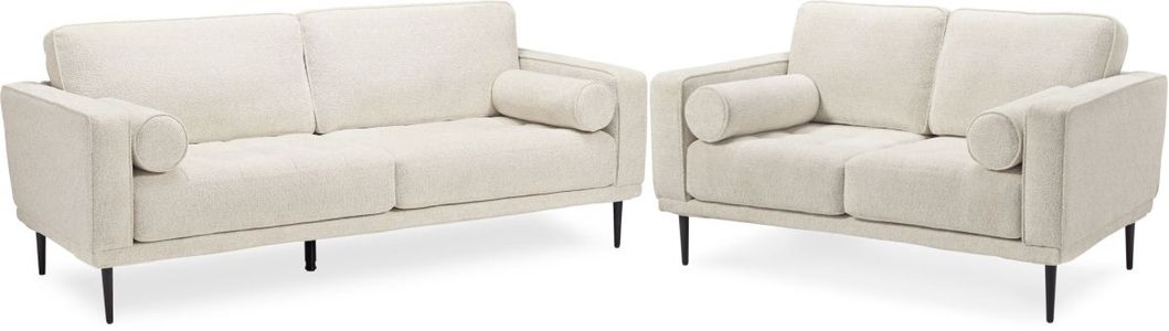 This designer package combines the clean lines of mid-century style with the cozy softness of your favorite blanket to create your favorite piece of furniture. The textured chenille upholstery evokes a feeling of comfort and security while the faint chevron pattern, bolster pillows and exposed black metal legs add sophistication.Read More