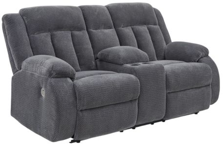There's no need to sacrifice looks for comfort—this Observation power reclining loveseat with console serves up both, plus a richly relaxed sense of style. Its steel-hued velvet upholstery is ultra soft, with a plush waffle weave for an added layer of interest.Read More
