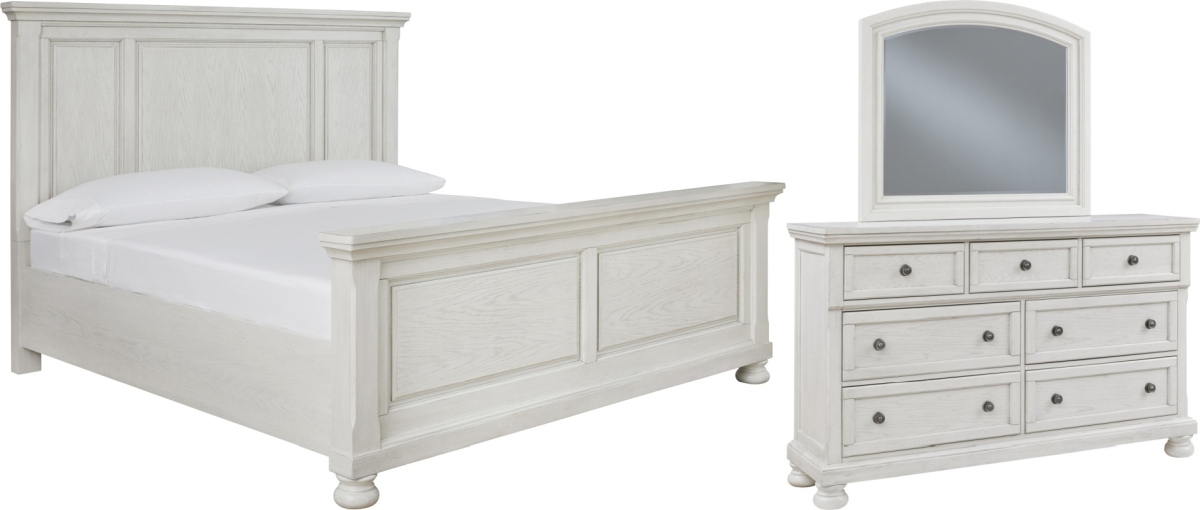 Includes California king panel bed (headboard, footboard and rails) and 7-drawer dresser with mirror