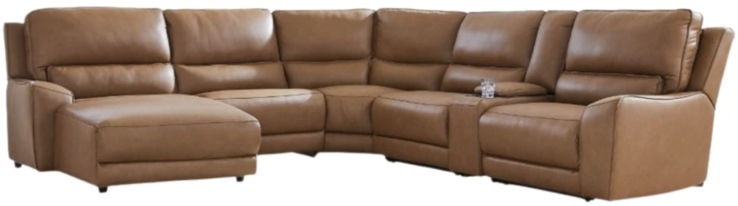 Live and lounge luxuriously. This power reclining sectional with chaise brings an ultra-stylish flair to your home’s central hub. Its seating area is wrapped in top grain leather in a rich caramel color, giving you a trend-right look made all the better with high-quality materials.Read More