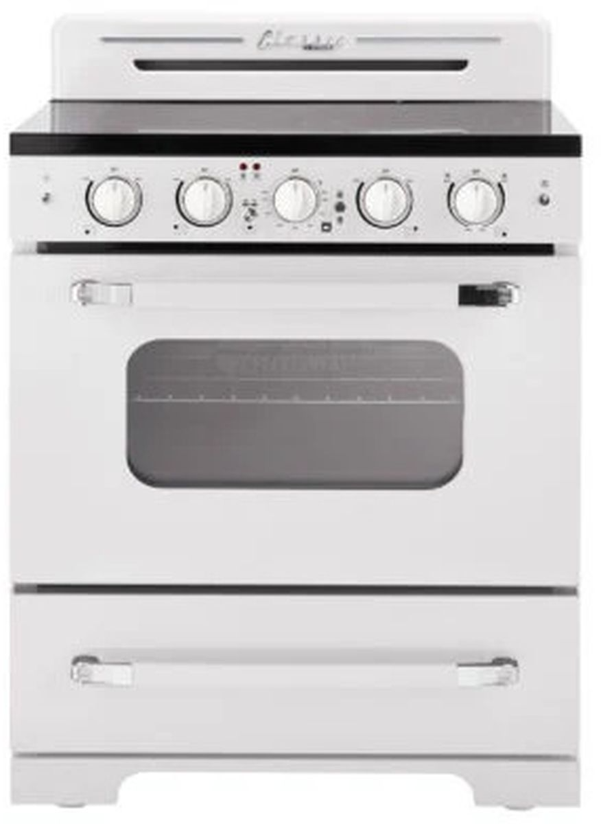 The 30" Classic Retro Electric Range transports you back to the ‘50s with its iconic retro design and chrome finished accents. It has a 5-element sleek glass electric cooktop capable of an intense sear or delicate sauce simmering. This range also allows for convection cooking circulating heat for incredibly even distribution.Read More